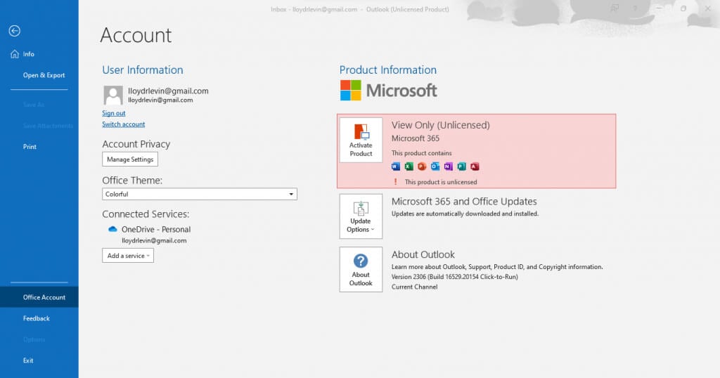 - Open the File menu and select the Office Account tab. This fills the right side with a bunch of options.