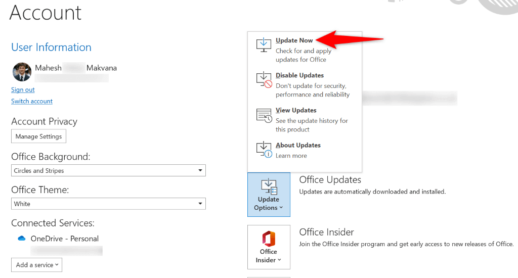 - Choose Office Account on the left and Update Options > Update Now on the right.