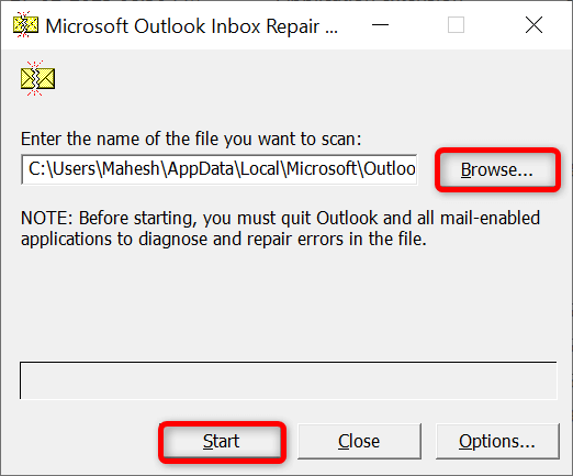 - Choose Start in the tool to begin scanning your file for errors. * Resolve issues with your file by choosing Repair. * Open Outlook when you’ve fixed your PST or OST file.