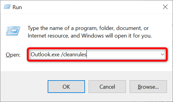 - Type the following in the box and press Enter: Outlook.exe /cleanrules