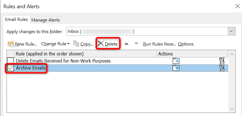 - Select the rules you’re comfortable removing on the Rules and Alerts window.