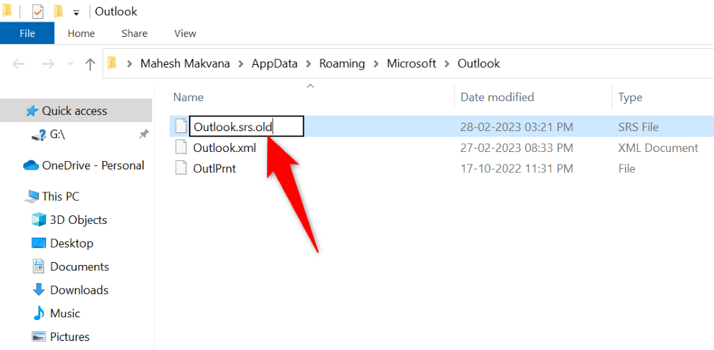 - Change the file name to Outlook.srs.old.