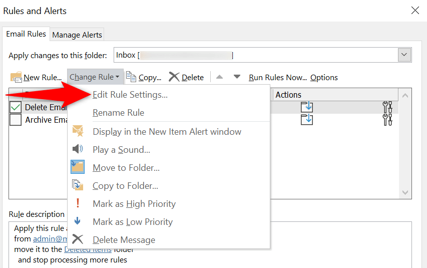 - Choose your rule on the list and select Change Rule > Rule Settings at the top.