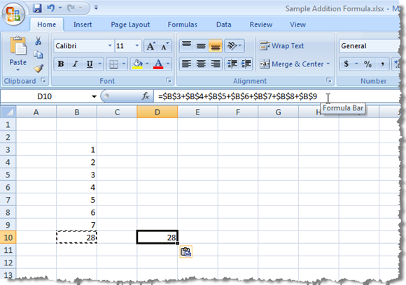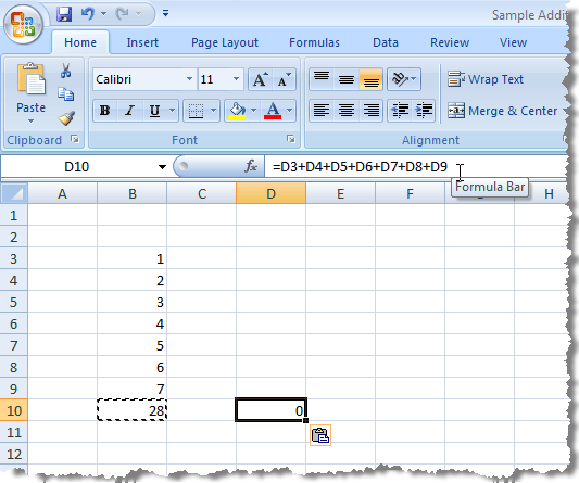 When we copy (Ctrl + C) the formula in the image above, and paste (Ctrl + V) it into another cell, you’ll notice that the cell references change from the B column to the D column, so the total is different.