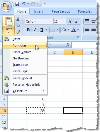 Make sure the Home tab is the active tab on the ribbon. Click the arrow on the Paste button in the Paste section of the Home tab. Select Formulas from the drop-down menu.
