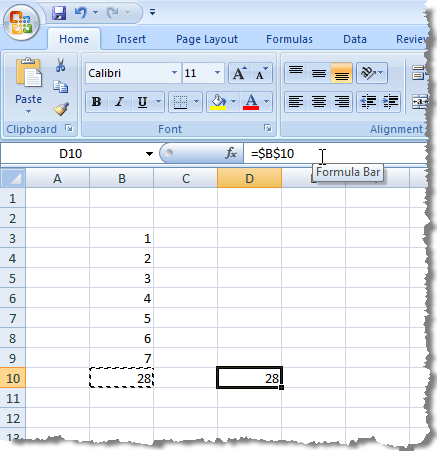 You will notice that the total displays in the destination cell from the original cell, and the formula that displays in the Formula Bar for the destination cell contains the same absolute references as the original formula in the original cell.