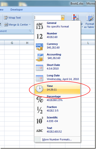 Unfortunately, there is no function to insert only a dynamic time stamp into Excel. However, you can change the formatting of the cell to make the NOW function display only the time. Click the Home tab on the Ribbon and locate the section labeled Number. Click on the drop-down menu and select Time from the menu options.