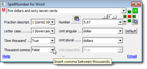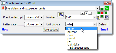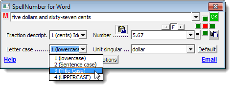 The SpellNumber for Word dialog box displays. There are several options for you to customize the spelled-out number. For example, use the Letter case drop-down list to specify how the words in the spelled-out number will be capitalized, if at all.