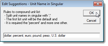 If you selected the Edit suggestions option, the Edit Suggestions dialog box displays. Add more options in the edit box, separating each option by a semicolon (;). At least, the “percent” option is required plus one other option.
