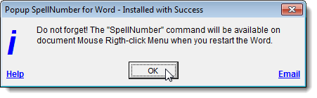 Once the installation is finished, the Installed with Success dialog box displays. It tells you how to access the SpellNumber add-in within Word. Click OK.
