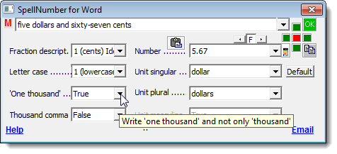 The Unit plural drop-down list is similar to the Unit singular drop-down list, allowing you to specify how the plural unit for the amount entered should be written out. If you want to write out “one thousand” for 1000, rather than just “thousand,” select True from the ‘One thousand’ drop-down list.