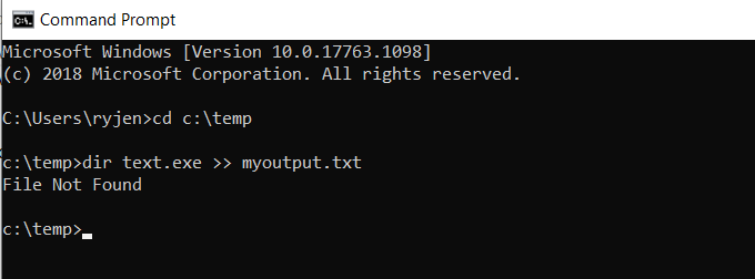What if you don’t want to overwrite the same file? Another option is to use » rather than > to redirect to an output file. In the case of this example, you would type: dir test.exe » myoutput.txt