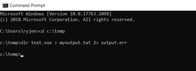 In this example, you’ll type the command: dir test.exe > myoutput.txt 2> output.err