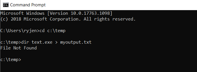 Using the example above, if you only want Standard Output and no Standard Error at all, you can use the following command: dir test.exe 1> myoutput.txt 2>nul