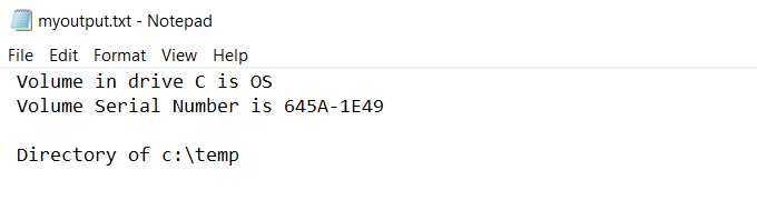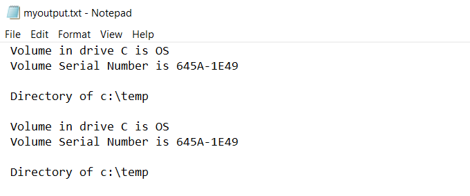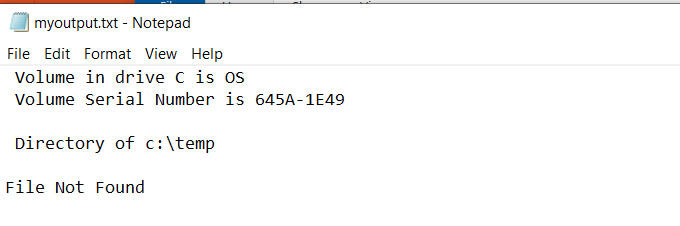 You can view the standard output that went to the file by typing “myoutput.txt” in the command window. This will open the text file in your default text file viewer. For most people, this is usually Notepad.exe.