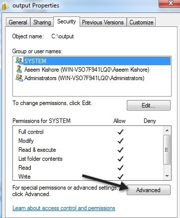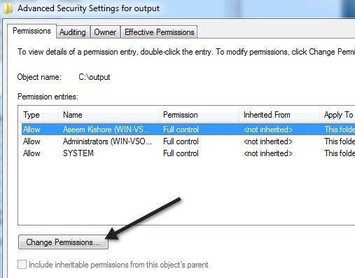 Then, you need to click on the Advanced button and click on** Change Permissions**.