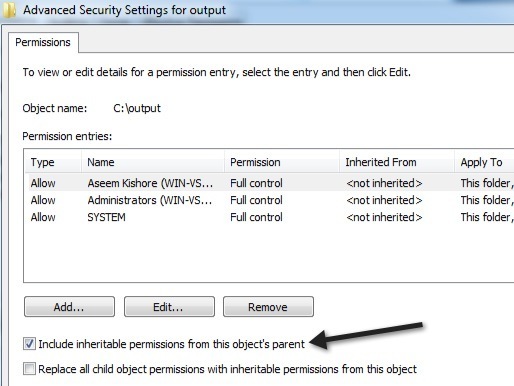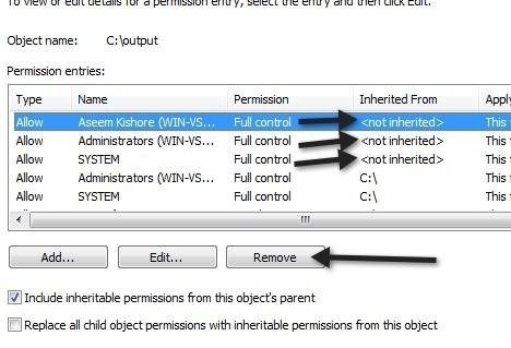 Next, you need to check the box that says** Include inheritable permissions **from this object’s parent.