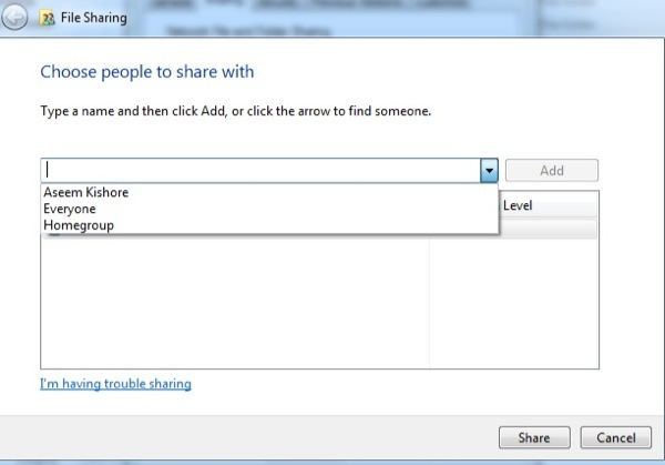 You can type in a name or you can choose from Everyone or Homegroup. Again, to remove the share, there is no option. You simply have to remove people or groups from the list box below. Again, the instant you do that, the lock icon appears.