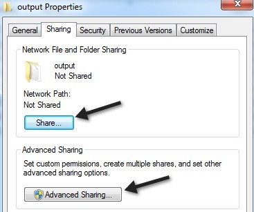 Now the other way you can share is by right clicking on the folder and going to Properties. If you go the Sharing tab, you’ll see two options:** Network File and Folder Sharing** and Advanced Sharing.
