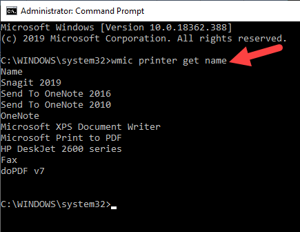 - In the Command Prompt window, type this command: wmic printer get name and press Enter to see the list of printers on your device.