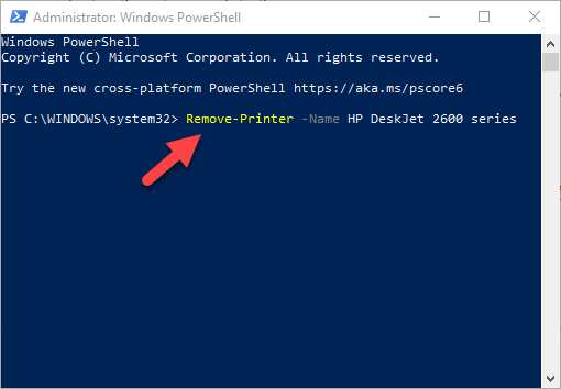 - Type this command: Remove-Printer –Name “YOUR-PRINTER-NAME”.