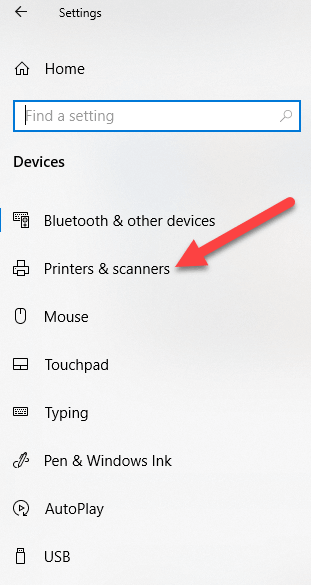- Open Settings>Devices>Printers and Scanners on the left pane.