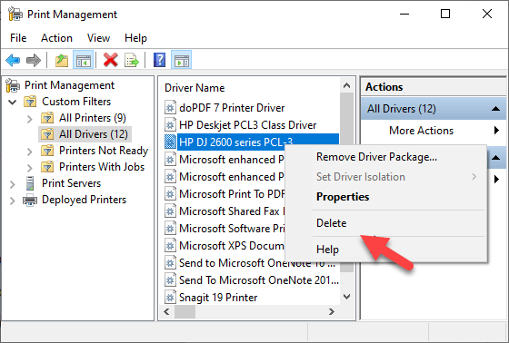 The Print Management dialog shows you the printers and current print jobs on your device. Before you delete the old printer driver though, make sure it’s not being used by any other printer.