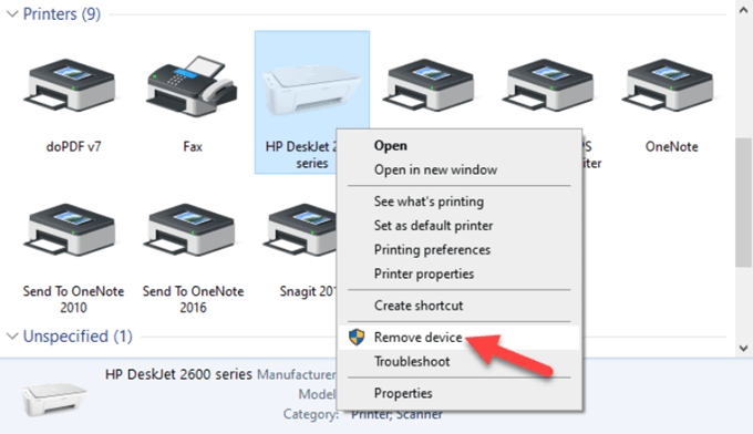 - Under Printers, right-click your device and click Remove device. Click Yes to confirm the action.