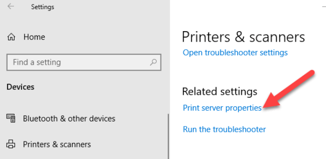 - Scroll down to Related settings and click Print Server Properties. Alternatively, you can right-click Start>Run and type printui /s /t2 to go to the Print Server properties page directly.