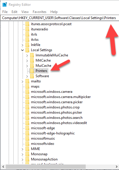 Find the registry key: **HKEY_CURRENT_USERSOFTWAREClassesLocal SettingsPrintersRoamed**