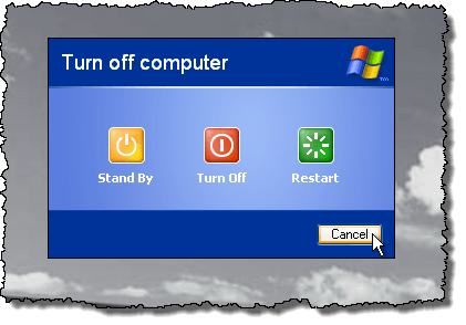 The desktop turns shades of gray in the background and the Turn off computer dialog box displays with three options and a Cancel button. Press and hold Ctrl + Alt + Shift and click the Cancel button.