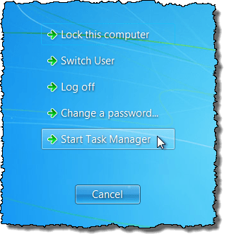 The Taskbar goes away and the desktop icons seem to disappear. To access the Task Manager to restart the explorer.exe process, press Ctrl + Alt + Delete. A screen displays with five options. Select Start Task Manager.