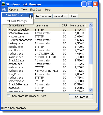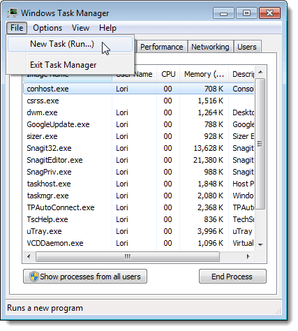 In the Task Manager, select New Task (Run…) from the File menu.