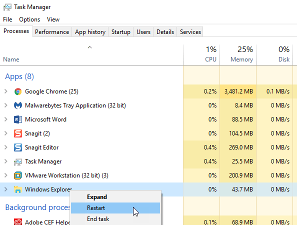 Up at the top where it says Apps, find Windows Explorer and right-click on it. One of the options will be Restart. In Windows 10, the process is killed and then automatically restarted. You don’t have to go to File – Run New Task to start it up again like you do in Windows 7 and earlier. ## Windows 7 and Vista