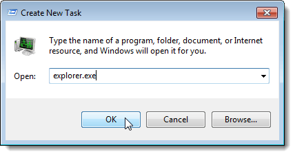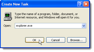 The Create New Task dialog box displays. Type “explorer.exe” (without the quotes) in the Open edit box and click OK. The Taskbar, desktop, and other components of Windows are restored.