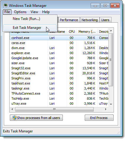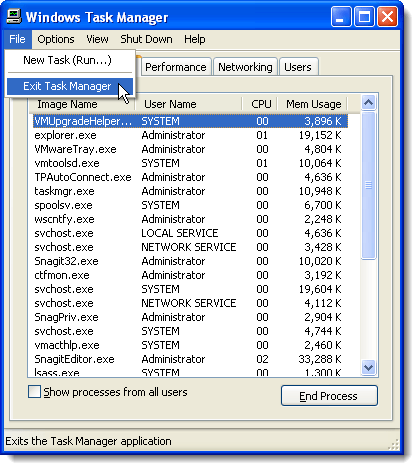 To close the Task Manager, select Exit Task Manager from the File menu.