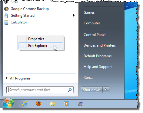 To correctly shutdown the explorer.exe process in Windows 7 and Windows Vista, open the Start menu. Hold down the Ctrl and Shift keys and right-click on any empty space on the Start menu. A short, popup menu displays with two options. Select the Exit Explorer option.