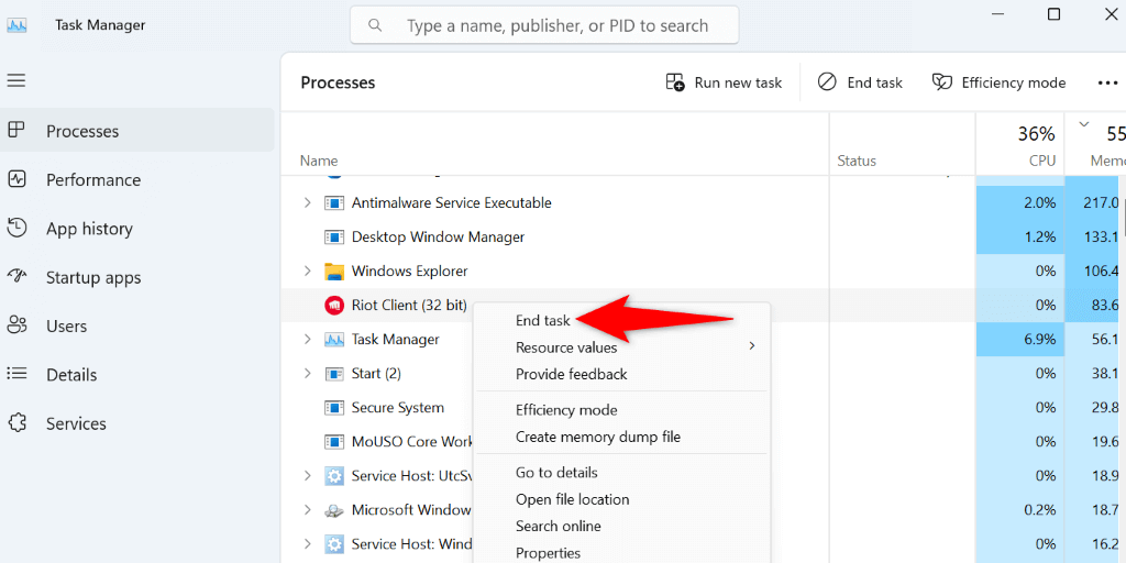 - Right-click the Start menu icon and choose Task Manager. * Open the Processes tab, find instances of Riot Client, right-click each instance, and choose End task.