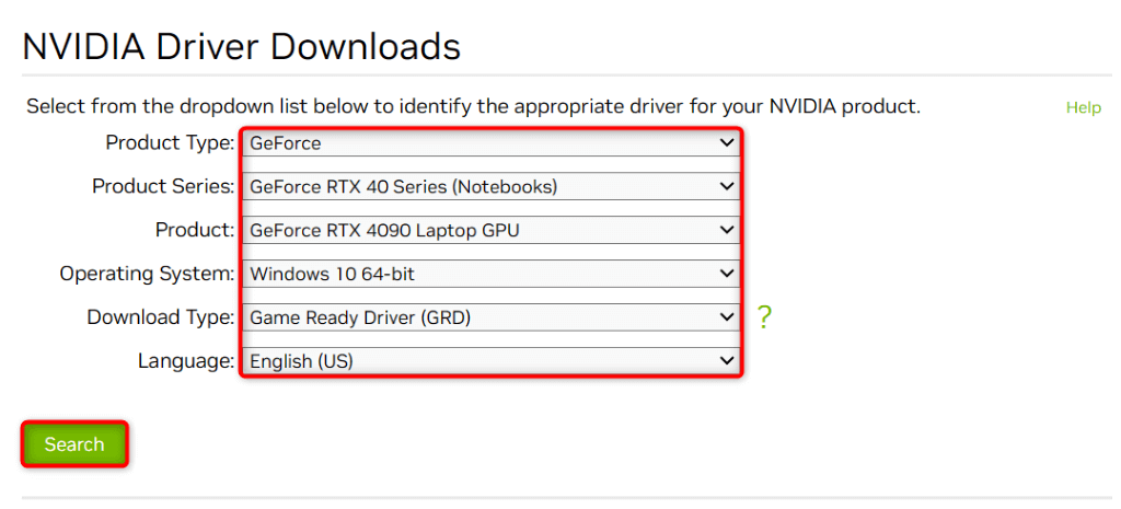 - Select your graphics card using the drop-down menus and choose Search.