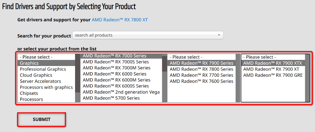 - Select your graphics card in the Find Drivers and Support by Selecting Your Product section and choose Submit.