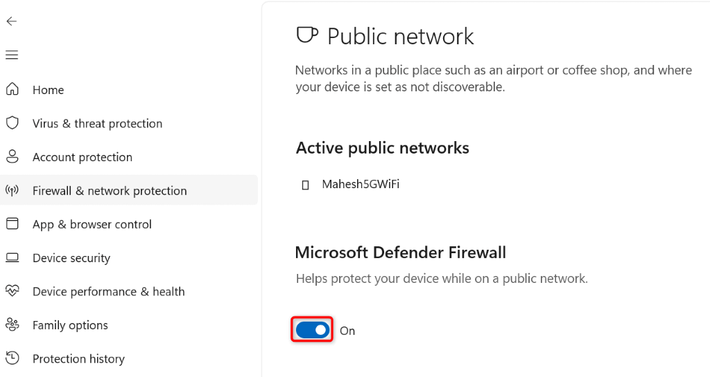 - Select Yes in the User Account Control prompt. * Select Firewall & network protection in the left sidebar. * Choose the network that says (active). * Turn off Microsoft Defender Firewall.