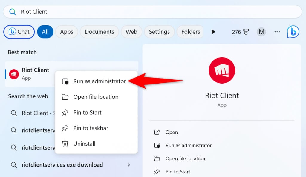 It’s possible Riot Client doesn’t have the required permissions to function. This usually happens when you run the app from a regular and not an admin account. You can fix the issue by launching the app as an administrator (without actually switching to an admin account).
