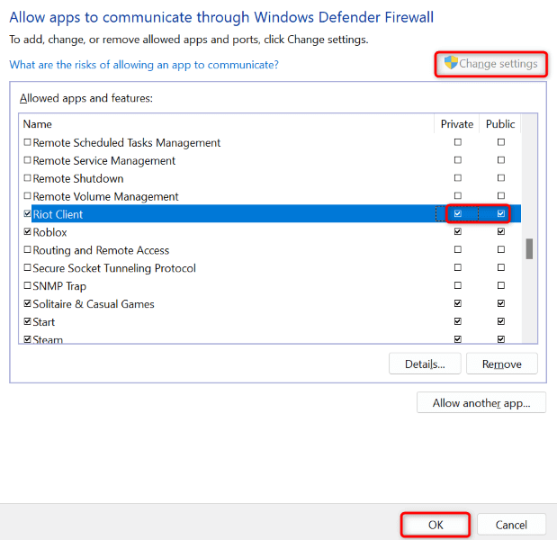 - Enable both Private and Public checkboxes next to Riot Client on the list. If you don’t find the app on the list, select Allow another app and add the app to the list.