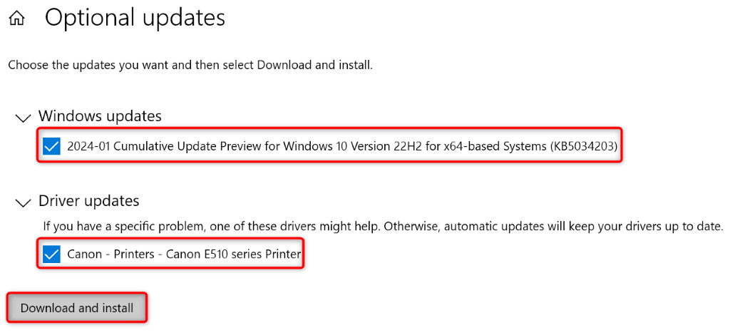 - Activate the checkboxes for all the displayed updates and select Download and install.