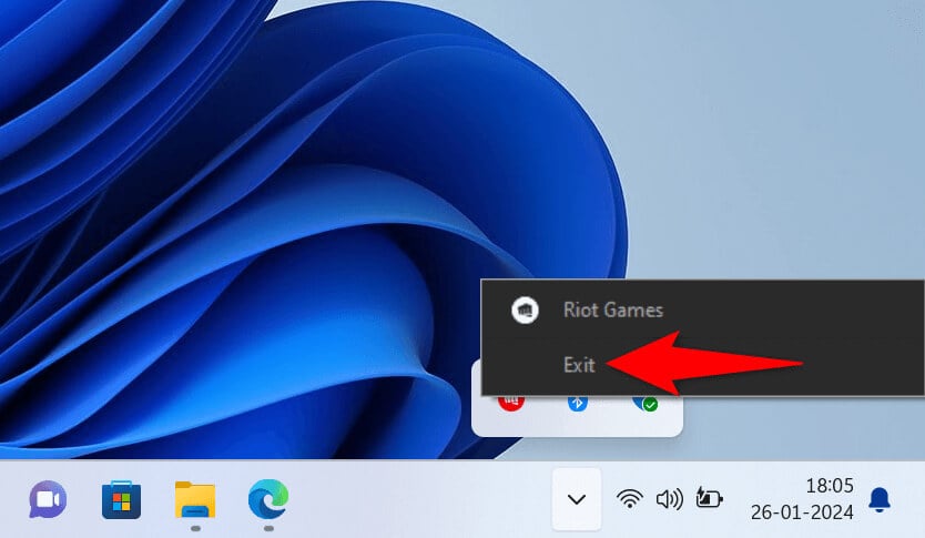 - * Look for Riot Client in Windows’ system tray, right-click the app, and select Exit.