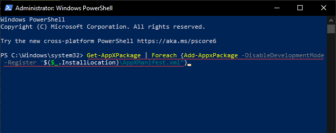 Get-AppXPackage | Foreach {Add-AppxPackage -DisableDevelopmentMode -Register “$($_.InstallLocation)\AppXManifest.xml”}