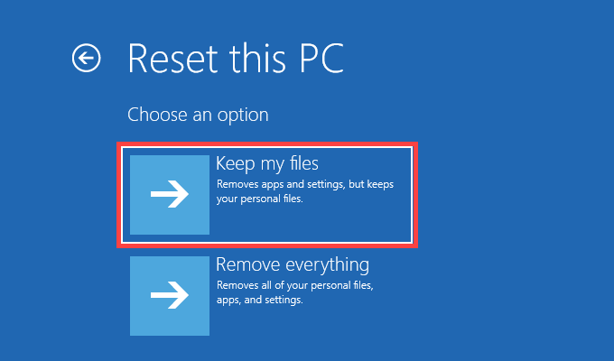 Select Keep my files and follow all on-screen instructions to complete the reset procedure.