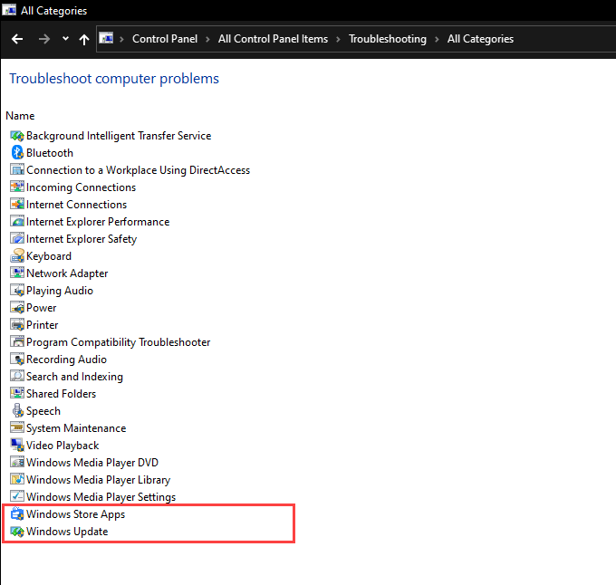 Select the View all option to the top-left of the window. That should bring up a list of built-in troubleshooters in Windows 10.