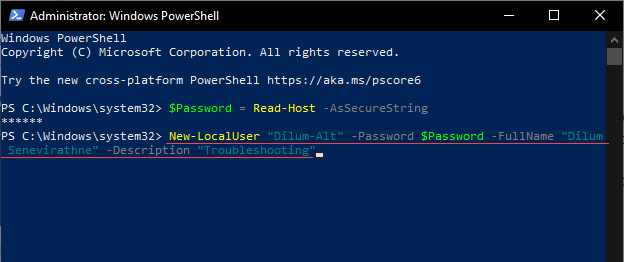 Type $Password = Read-Host -AsSecureString and press Enter. Then, type the password you want to add to the account you’re about to create and press **Enter **again.