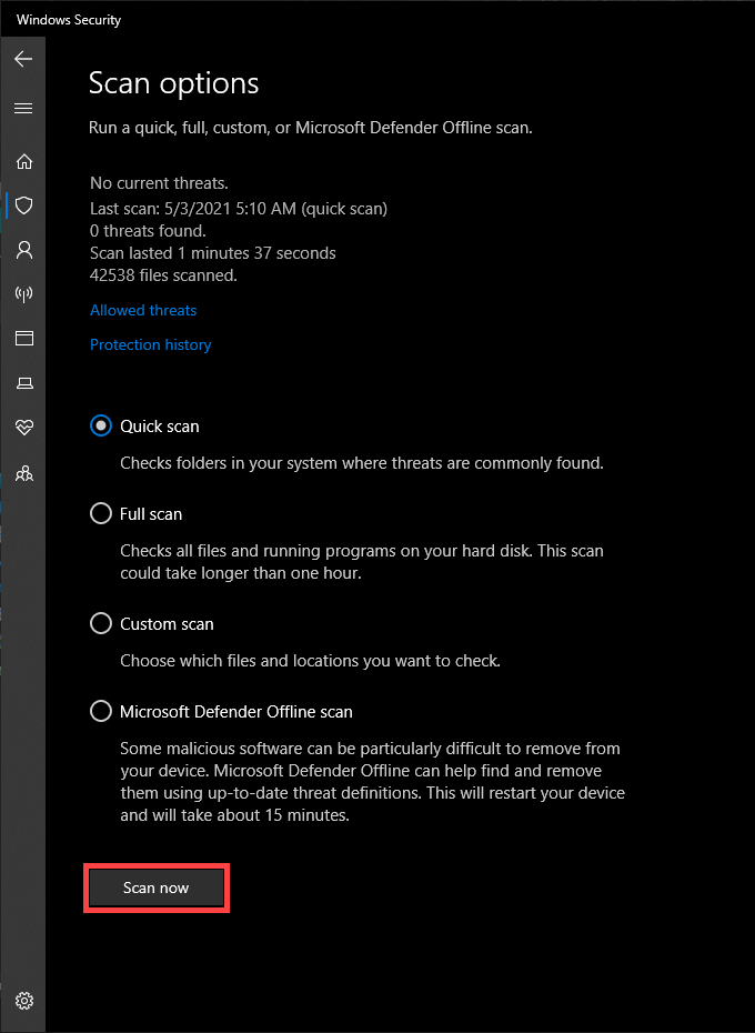 Pick the Quick scan option and select Scan now.